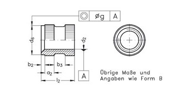 Резьбовая вставка DIN 16903 форма D — это круглая закладная цилиндрическая втулка со сквозным отверстием, наружными насечками и упорным кольцевым выступом. Она предназначена для формирования прочного резьбового соединения в изделиях, изготовленных методом литья пластмасс под давлением. Втулка устанавливается в форму заранее, до заливки пластика, что обеспечивает монолитное интегрированное крепление без дополнительной механической обработки.