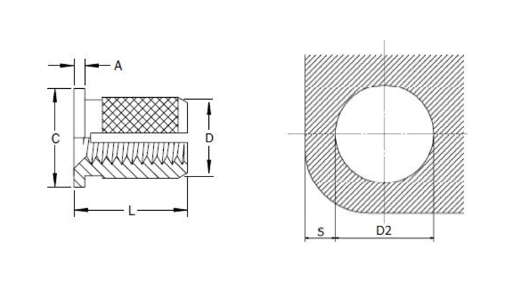 Втулки PRESLOK-B монтируются в готовые детали простым надавливанием в подготовленное гнездо. Установка выполняется молотком с резиновой/полиуретановой накладкой, тисками или ручным прессом. Такой способ снижает расходы на производство, устраняет риск брака, связанный с неправильной закладкой втулок при формовании, и исключает необходимость дополнительной обработки внутренней резьбы.