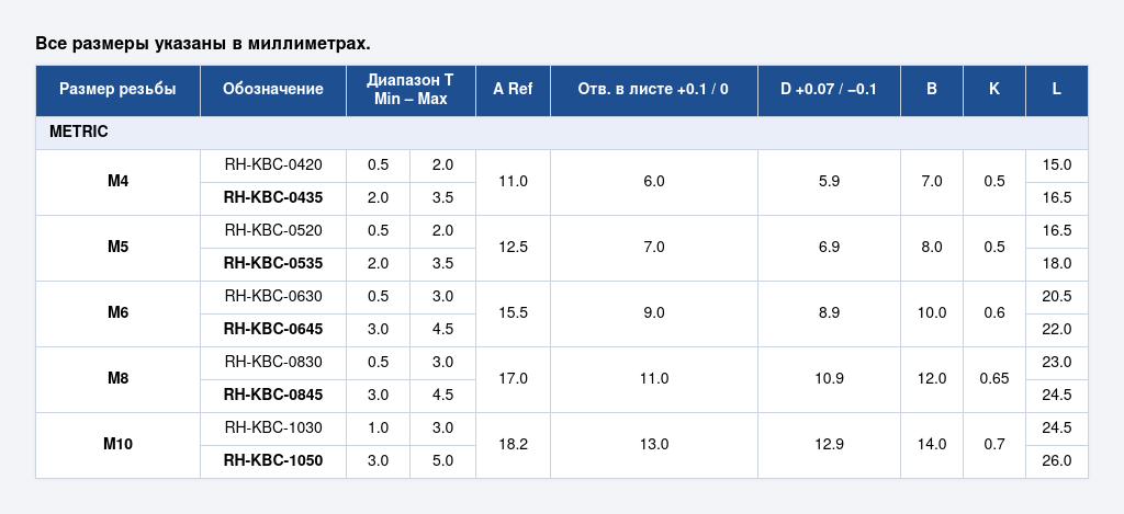 RH-KBC применяются в машиностроении, электротехнике, строительстве, мебельной и приборостроительной промышленности, а также при сборке металлических корпусов и каркасных конструкций.