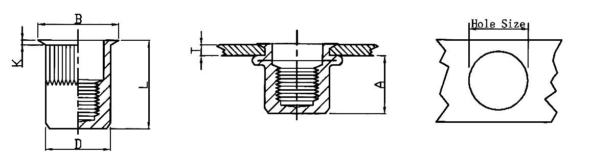 Заклёпка имеет внутреннюю резьбу для установки метрических болтов или винтов, а фланец с рифлением надёжно фиксируется в материале, предотвращая проворачивание при нагрузках. Монтаж выполняется при помощи ручного или пневматического заклёпочника без сварки и пайки.