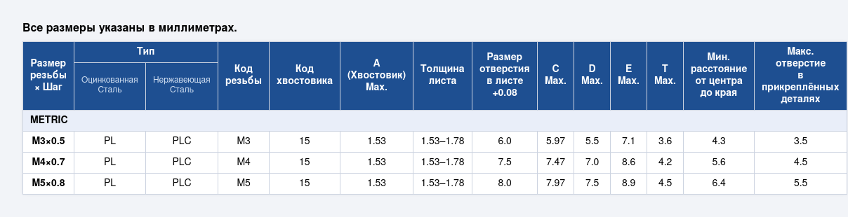 Применение:Гайки PL / PLC используются в машиностроении, электронике, приборостроении, телекоммуникационном оборудовании и корпусных конструкциях, где требуется компактное, надёжное и виброустойчивое резьбовое соединение.