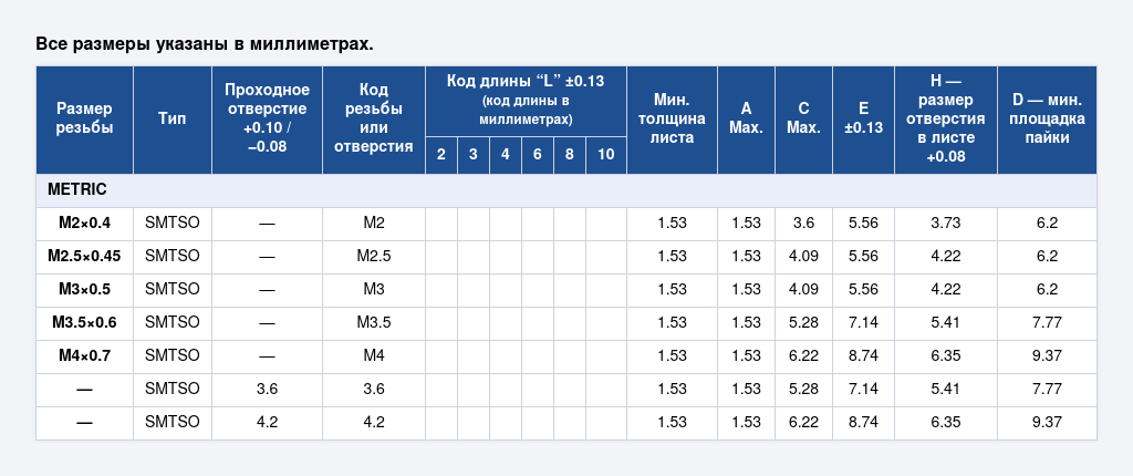 Применение:- Втулки SMTSO используются в машиностроении, приборостроении, электронике, строительстве и корпусных конструкциях для создания прочных, точных и долговечных резьбовых соединений в тонколистовом металле.