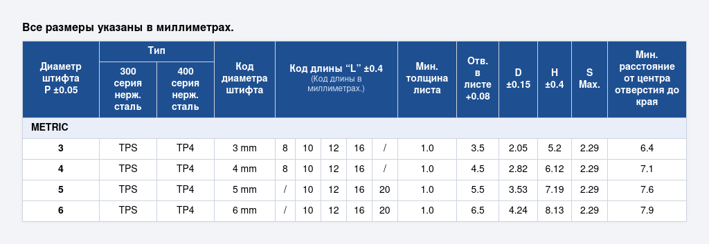 штифты TPS/TP4 обеспечивают плотную посадку в материале, предотвращают проворачивание и смещение даже при вибрационных и динамических нагрузках. После установки формируют прочное и долговечное соединение с точным позиционированием деталей.